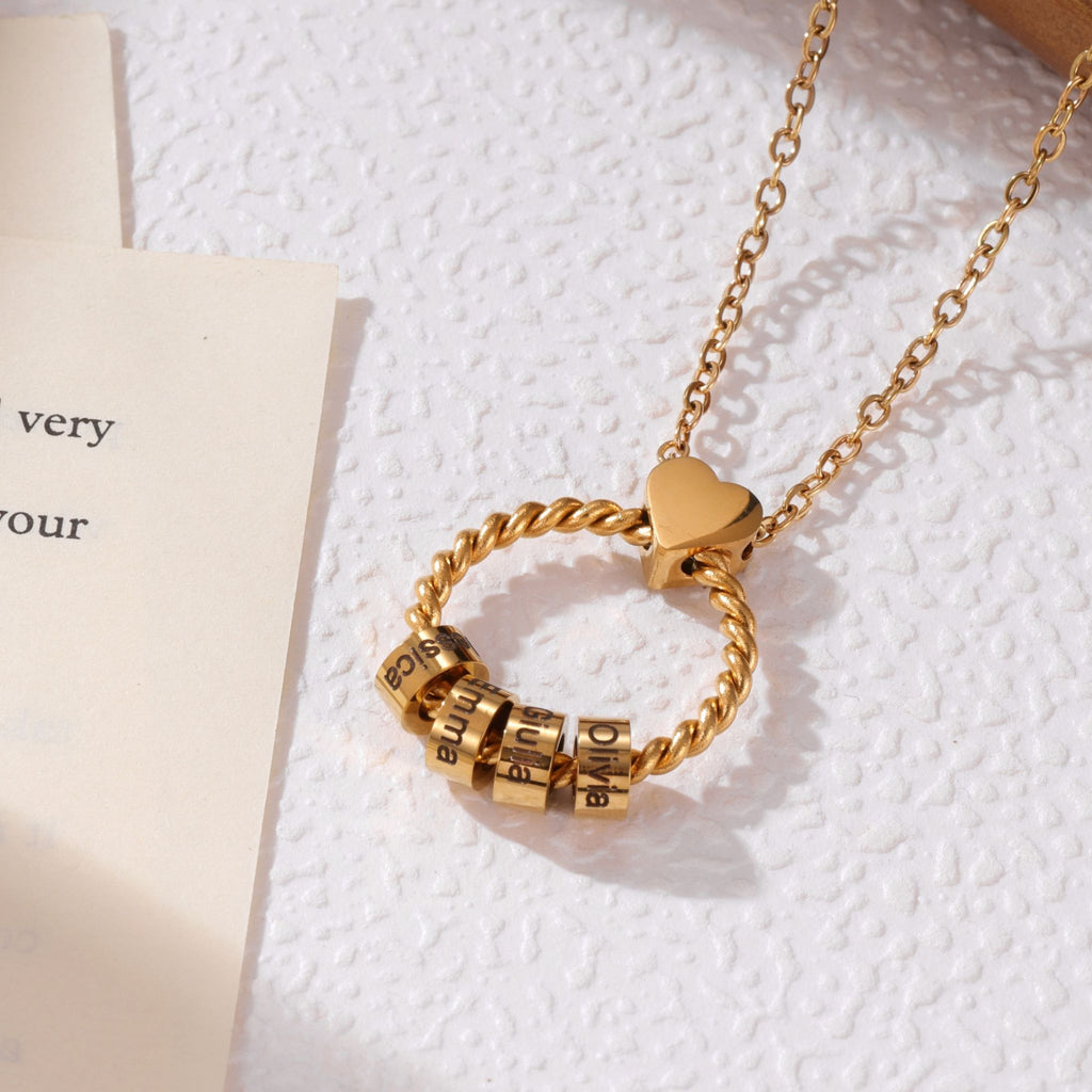 Célébrez vos liens les plus précieux avec ce collier cercle raffiné, orné d’un petit cœur et de charms gravés à vos souhaits. Chaque anneau peut accueillir un prénom, un mot ou une date, pour créer un bijou profondément personnel.